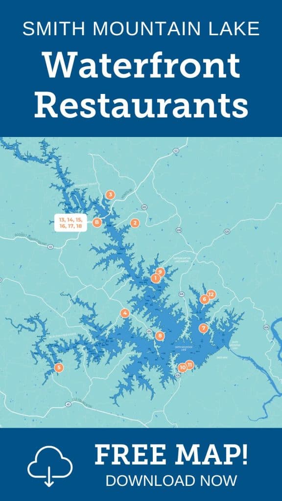 Download a printable map (with channel markers!) or jump to an interactive map of Smith Mountain Lake’s waterfront restaurants.