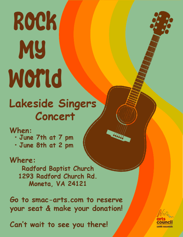 Lakeside Singer Concert: Smith Mountain Lake’s community chorus presents “Rock My World” at Radford Baptist Church. June 7 at 7 p.m. and June 8 at 2 p.m.