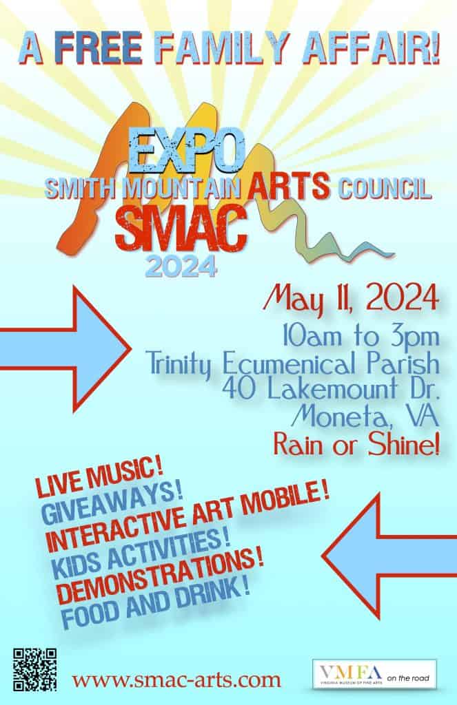 Arts Expo: Free event with live music, interactive art mobile, giveaways, food and drink, kid activities and demos presented by the Smith Mountain Arts Council. 10 a.m. to 3 p.m. at Trinity Ecumenical Parish.