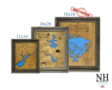 Below is a sampling of additional lake house maps that illustrate the different sizes, finishes and framing options available. Scrolling through it is a great way to get design inspiration by seeing how others have personalized their lake wood signs.
