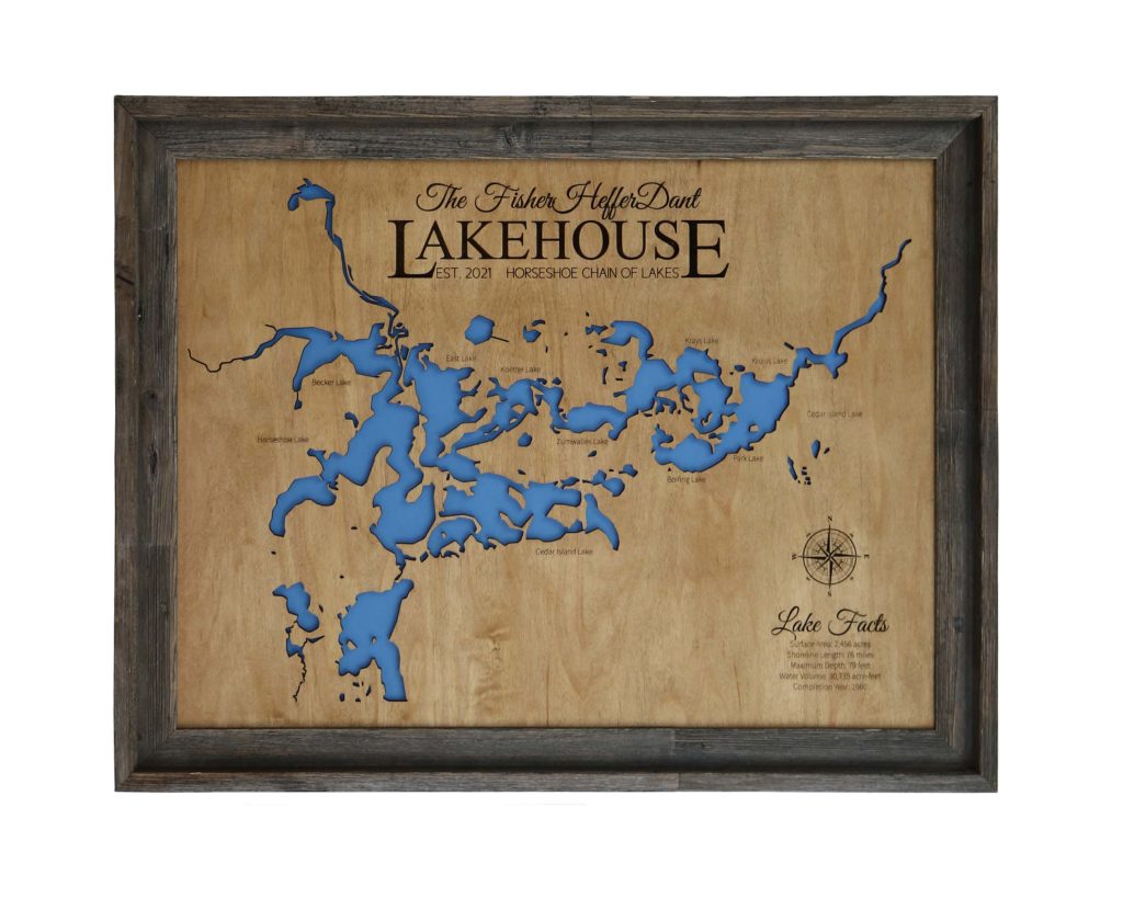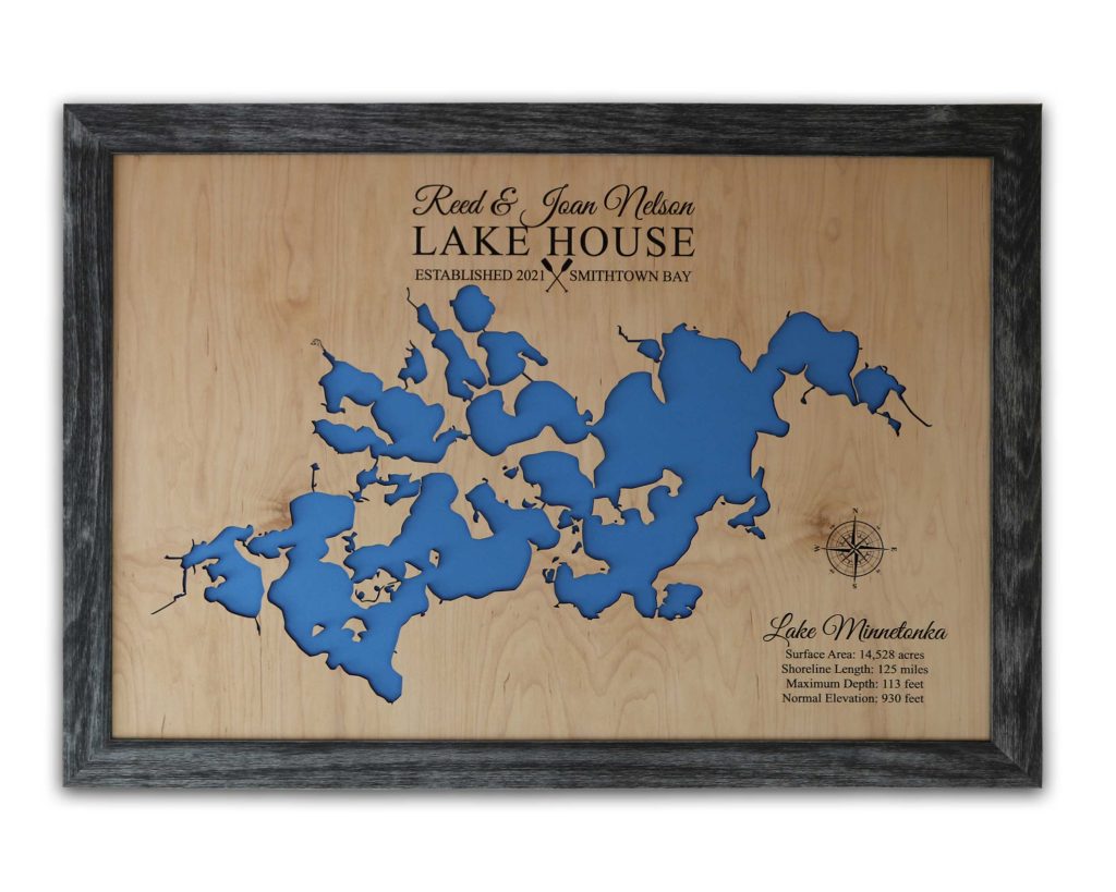 Simply select the size, finish and frame type you prefer, then create the personalization. You’ll enter your lake name and any additional details you think are helpful. There a number of choices for these beautiful wood lake maps so the most difficult part may be deciding on your favorites!