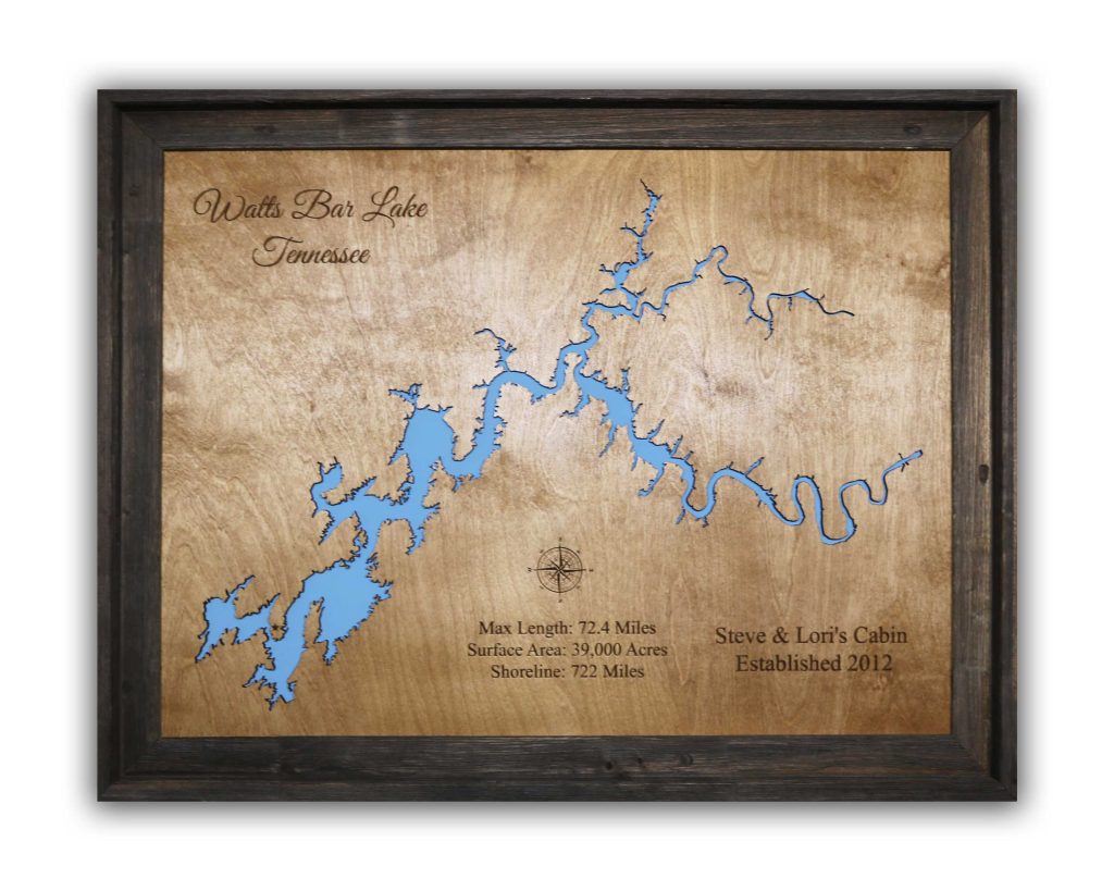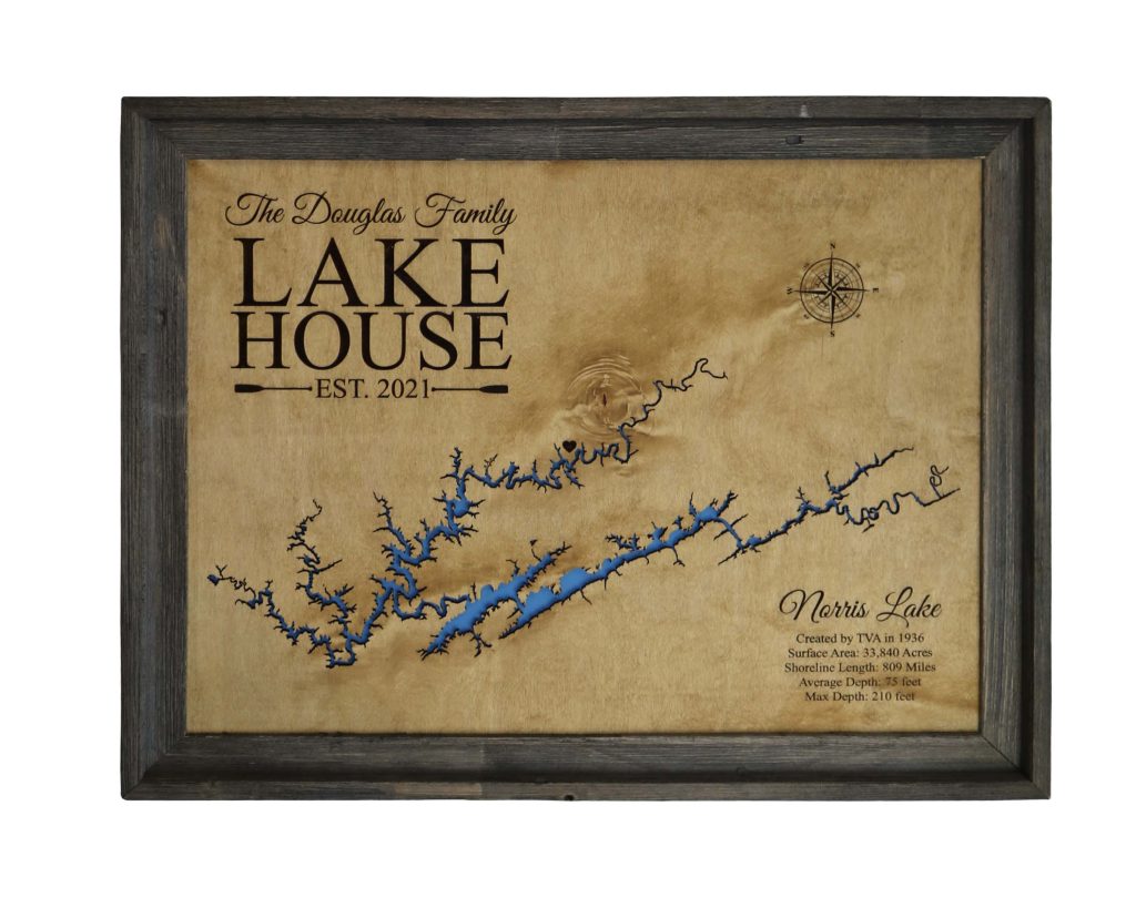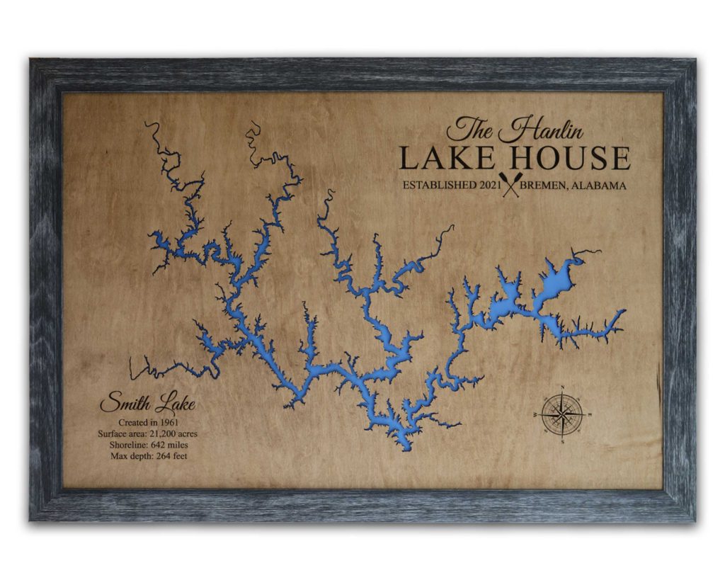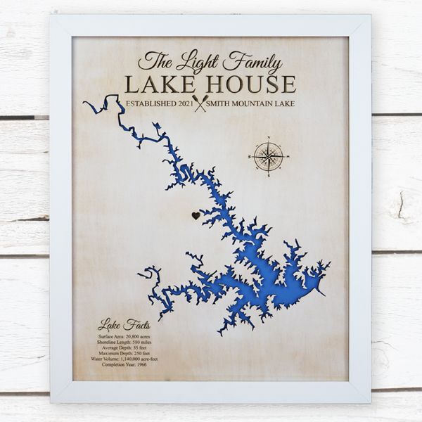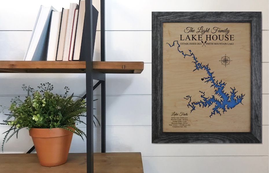 Either way, you get to choose from a variety of sizes, finishes and framing options for your custom made Smith Mountain Lake wood map. Each is 3D lake house wall art that is laser cut and comes completely ready to hang.